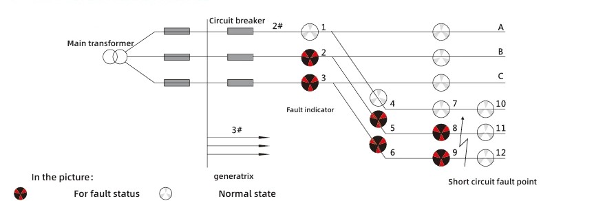 Adhedhasar karakteristik cacat sirkuit cendhak, kritéria tumindak yaiku owah-owahan dumadakan ing arus sing diiringi kegagalan daya piranti proteksi. Logika interpretasi saka diagram indikasi kesalahan kaya ing ngisor iki: yen indikator 2, 5, lan 8 fase A lan indikator 3, 6, lan 9 fase C baris 2 kabeh dadi abang, dene indikator 11 lan 12 tetep putih, mula bisa ditemtokake yen ana gangguan hubung singkat ing titik garis metu kasebut.