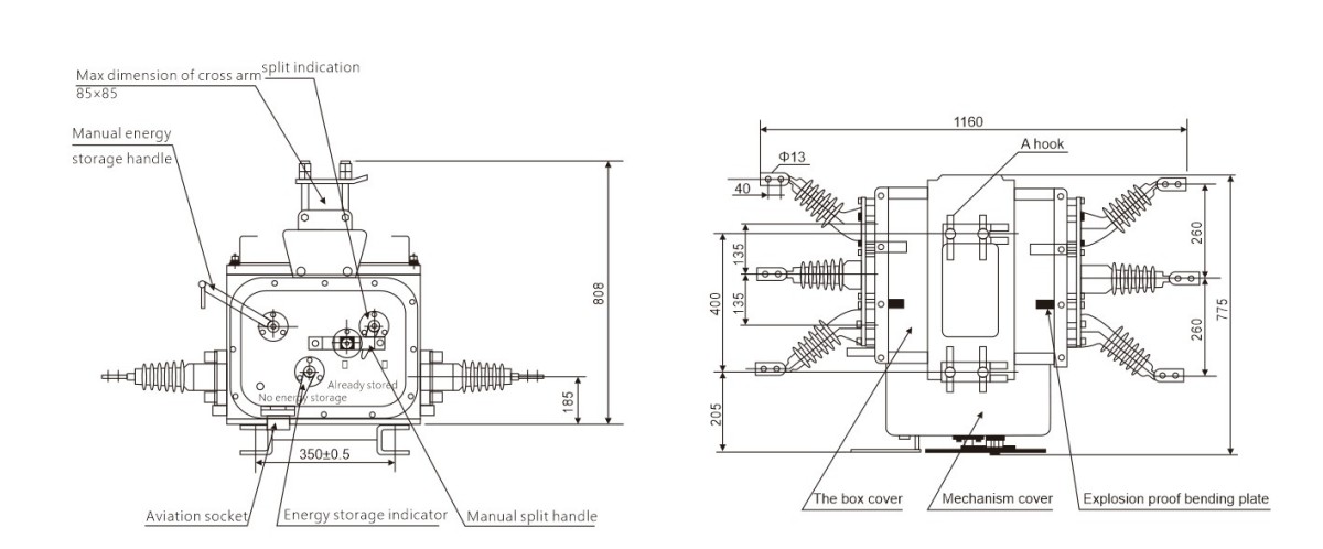 ZW20 Series Outdoor SF6 Vacuum Circuit Breaker digawe ing China uga dilengkapi fungsi praktis ekstra: proteksi overcurrent, indikator panyimpenan energi spring mekanisme, lan soket penerbangan kanggo sambungan listrik sekunder. Gampang banget dipasangake karo pengontrol sing cerdas.